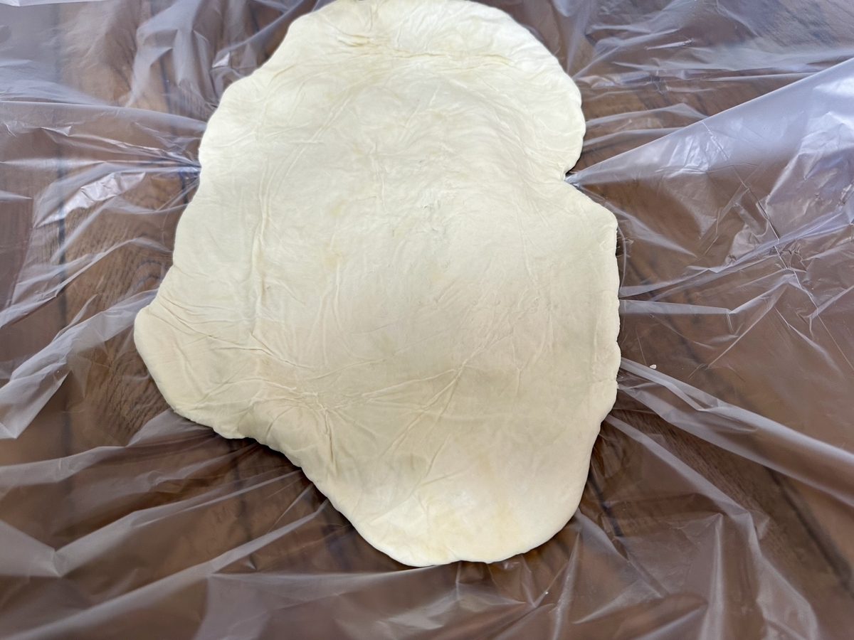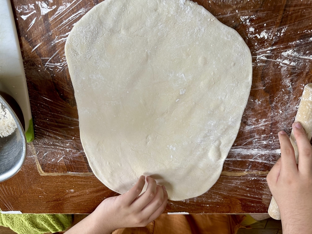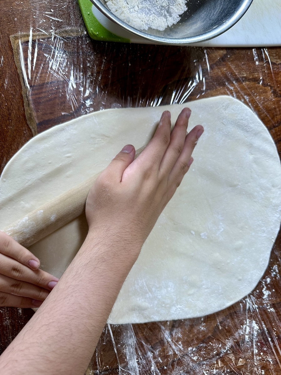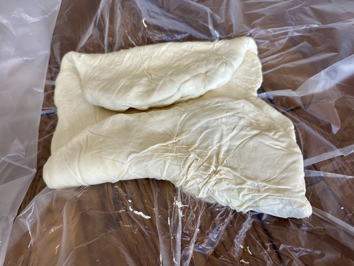 伸ばし終わったら、打ち粉をしながら折りたたみます。